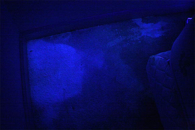 NEWS: We're proud to now be distributors of some fantastic subsurface extraction tools, which are specifically designed to pull impurities from not only your carpet fibers, but also your carpet backing, pad and even subfloor. These have only been available to professionals, but are now available here and start at just $47.99 with free shipping! You can learn more about these SOS Subsurface Extraction Tools on our PRODUCTS page (and be sure to follow the Learn More link for tons more photos, case studies and tips). These tools provide the same functionality as pro-only tools (called Water Claws) that cost hundreds more. Even many professional carpet cleaners don't possess this level of specialized tooling, so for a very low investment (starting at just $47.99!), you'll be performing pro-level odor and stain remediation yourself...and without even breaking a sweat, because the tool does the work for you. I highly encourage you to learn more on the PRODUCTS page and to follow the link to our SUBSURFACE page. Regardless whether you use DooDoo Voodoo or not (and we certainly hope you do!), you and your animals could also benefit from purifying your air. We put together an educational page about how we accomplish this at our place, so check out our Freshen Air page. One of our favorite new tools is Dr. Whitaker's Neoair Plus Total Shield air purifier, which we bought more than a dozen of. · In early 2006, we undertook a whole-condo odor remediation job for a lady whose cats had soiled the home quite extensively, and whose realtor® told her that because of the odor, the condo would sell for $50,000 less than market value. She was ready to rip out the carpet, pad and tack strips, then treat the subfloor, but we urged her to let us first show her what DooDoo Voodoo could do all by itself. Interestingly, due to a medical condition, the lady has lost her sense of smell, which is both a blessing and a curse. Here are some pictures to set the scene for you. The thing the close-up pictures don't convey is that there was urination throughout the condo, not just in the corners and on the stairs. It had even run down from the balcony and had crept along the kitchen ceiling. There was a lot of spray on the walls, not just down by the floor where you might expect it to be, but up the walls from where the cats had sprayed while standing on the back of the couch, chairs, tables, etc. The first few shots show you the general layout of the condo, which is larger than it appears to be in the pictures due to the nature of the wide-angle lens I used. Note how pristine the carpet looks under normal lighting versus how it looks under blacklight. (Click the thumbnail pics to see 640x480 versions.) To read more of this story and see pictures taken throughout the entire process we went through to rid the place of odor, visit our page about salvaging pee-soaked subfloor. (There's a lot of info for those of you who may have urine or feces infiltration of your subfloor.) You can also download the whole case study as a PDF file (1.4MB in size). If you're in the Indianapolis area and need this sort of work performed, please contact us. If you just need carpet cleaning and are in the Indy area, we recommend Kolby Carpet Cleaning Company. They've cleaned our carpet for years and do a good, affordable job. Call them at 317-861-0211. Kolby cleans in the following counties: Marion, Hamilton, Boone, Hancock, Johnson, Hendricks and Morgan. To read more of this story and see pictures taken throughout the process we went through to rid the place of odor, click here. To see pictures taken in one of our bedrooms while I was remediating urine, vomit and poop stains from our little special-needs dog, Rocky, click here.