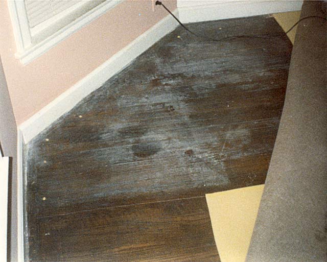 Now, I'd like to mention a product to you: GroutShield. While I've not used it specifically for the purpose of sealing in odors in grout (and I did not use it in the bathroom shown), I have used it for coloring/sealing grout, with good success. In the real world, it didn't turn out to be quite as easy to use as it looks in the videos (don't let it dry on the tile too long...that's all I'm saying), but it seems like a fantastic product that does what it purports to. Visit http://www.groutshield.com to learn more. I, personally, have found that DooDoo Voodoo is a FANTASTIC cleaner and brightener for grout, not to mention its odor-killing abilities. But if you desire to change your grout's color and keep liquids and dirt out of it, I recommend GroutShield. · From our archives (okay, a box on a shelf in our basement), here are some pictures of indiscriminate urination we were fighting back in the '80s when we started working on DooDoo Voodoo. We had a really cute house, built in the '40s, and it had beautiful carpeting and hardwood floors...until some of our rescued cats started their peeing contest. These three pictures show only a couple of the many areas we were dealing with. Click on the thumbnails to see 640-pixel-wide versions of the pictures.