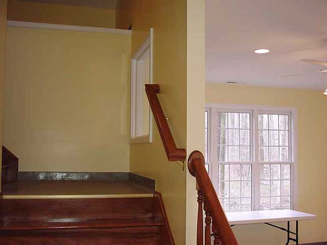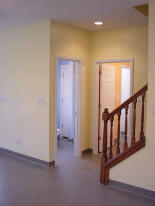 If you're perceptive, you'll notice an area above the landing that we call the "perch". Due to the architecture of the facility, this area was going to be walled off and forgotten about, but I told the contractor to epoxy the floor, paint it and dress up the front edge so the cats could hang out there. We leave a plastic step stool on the landing so the cats can climb up to the perch---even the amputee we had with us for some years until she found a home---and they "normally" come down via the stool, too. Uh, unless one of 'em gets spooked really badly and decides to...gulp...JUMP to the landing. This has happened a couple times and BOY does it look and sound painful. Luckily, no cats have gotten hurt.